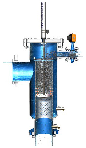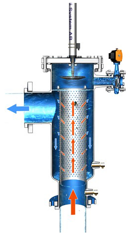 L’eau circulant dans l’espace entre ce disque et le panier filtrant subit une forte accélération et à ce niveau, d’après le principe de Bernoulli, la pression statique diminue. Le vide partiel, ou dépression ainsi créée, aspire et décroche les particules et débris retenus sur le panier filtrant. Simultanément, une vanne de chasse est ouverte, évacuant l’eau de lavage du filtre. Cette opération, de très courte durée, n’arrête pas la filtration, ne consomme que très peu d’eau et d’énergie, et ne perturbe pas le réseau en aval.