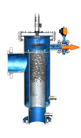La séquence de nettoyage est gérée par un double système de sécurité : soit par horloge programmable soit par contrôleur de pression différentielle (prioritaire). Durant Cette phase de quelques secondes, le piston reste en position haute et la vanne de chasse s’ouvre, permettant l’évacuation des plus grosses particules (40 mm maxi) hors du filtre.